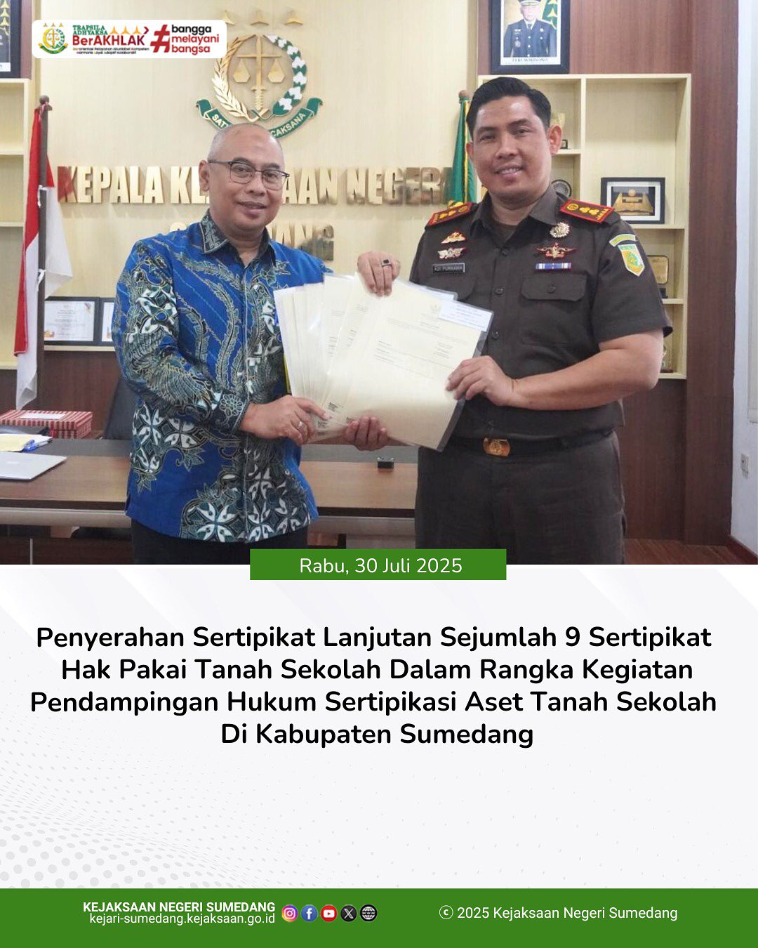 Penyerahan Sertipikat Lanjutan Sejumlah 9 Sertipikat Hak Pakai Tanah Sekolah Dalam Rangka Kegiatan Pendampingan Hukum Sertipikasi Aset Tanah Sekolah Di Kabupaten Sumedang